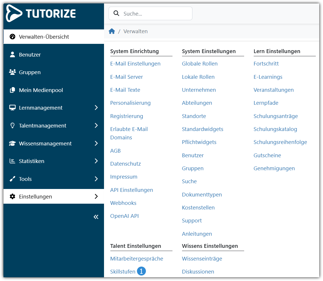 Um in die Talenteinstellungen zu gelangen und die Skillstufen zu verwalten benötigen Sie das globale Recht “Skills verwalten” oder “Technische Verwaltung”.