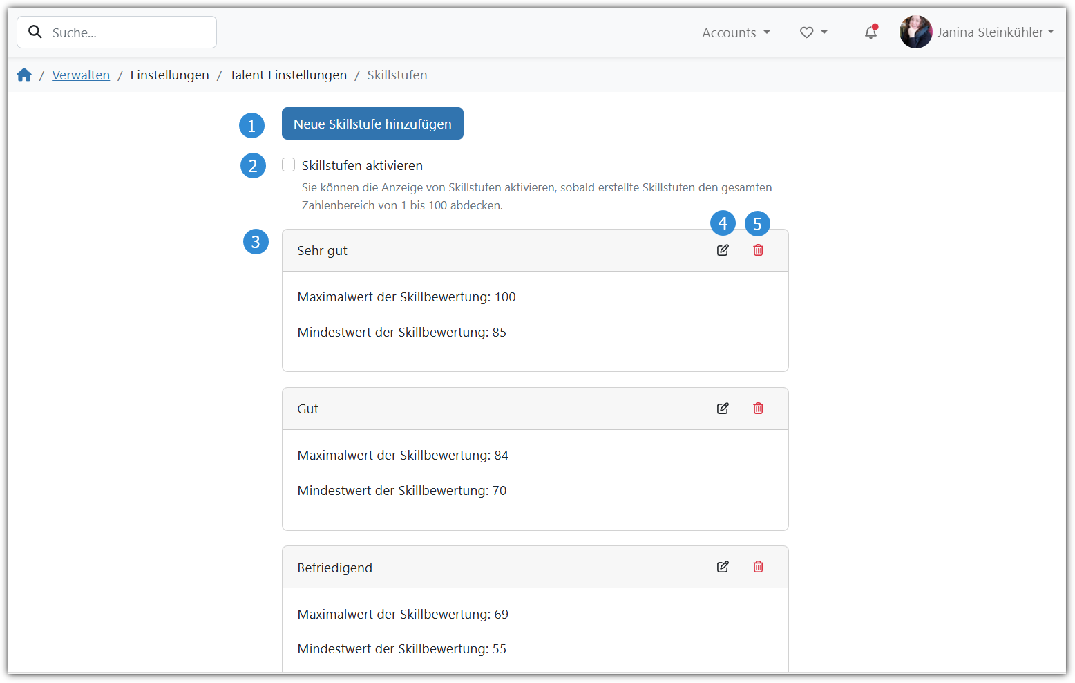 Sobald eine Skillstufe erstellt wird, erscheint Sie in der Liste mit Skillstufen (2.3) auf dieser Übersichtsseite und wird anhand ihres Zahlenbereichs einsortiert (höchste Werte oben).