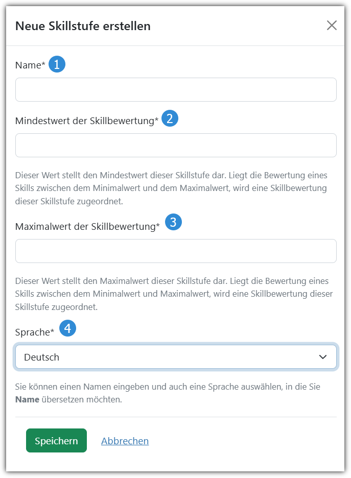 Im Feld “Name” (3.1) vergeben Sie einen Namen für die entsprechende Skillstufe.