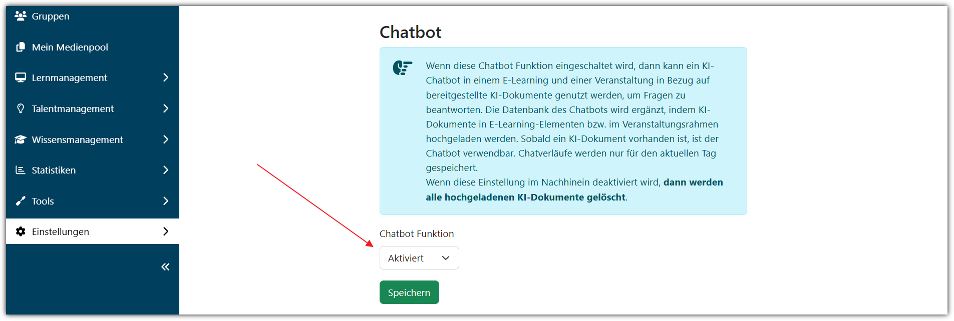 Wenn diese Chatbot Funktion eingeschaltet wird, dann kann ein KI-Chatbot in einem E-Learning und einer Veranstaltung in Bezug auf bereitgestellte KI-Dokumente genutzt werden, um Fragen zu beantworten. Die Datenbank des Chatbots wird ergänzt, indem KI-Dokumente in E-Learning-Elementen bzw. im Veranstaltungsrahmen hochgeladen werden. Sobald ein KI-Dokument vorhanden ist, ist der Chatbot verwendbar. Chatverläufe werden nur für den aktuellen Tag gespeichert.