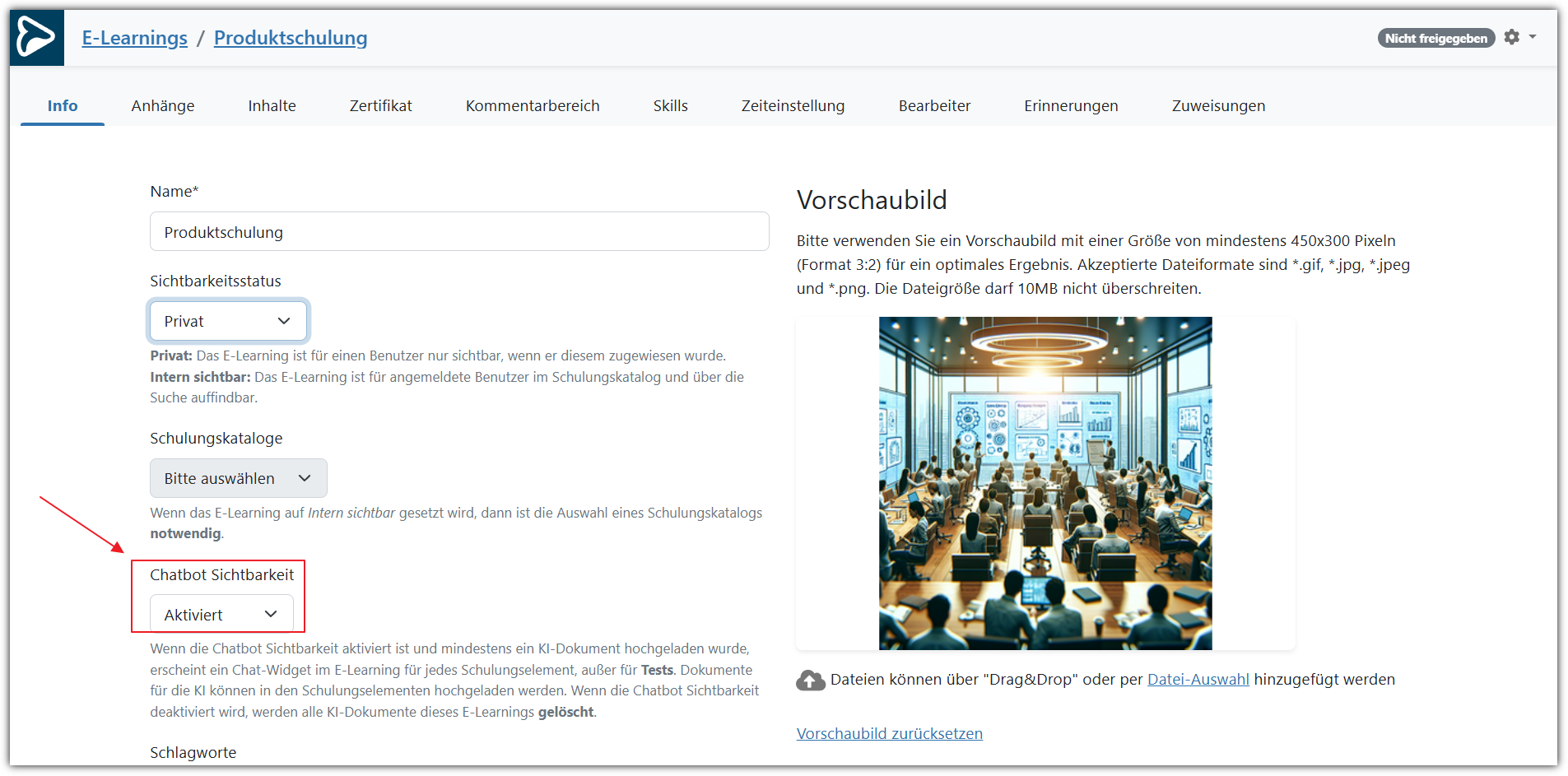 ACHTUNG: Wenn diese Einstellung im Nachhinein deaktiviert wird, dann werden alle hochgeladenen KI-Dokumente gelöscht. - Ist diese Funktion in den Einstellungen aktiviert, so findet man im Info-Tab jedes E-Learnings und jedes Veranstaltungsrahmens die Option, den Chatbot jeweils für die gewünschten Schulungen zu aktivieren.