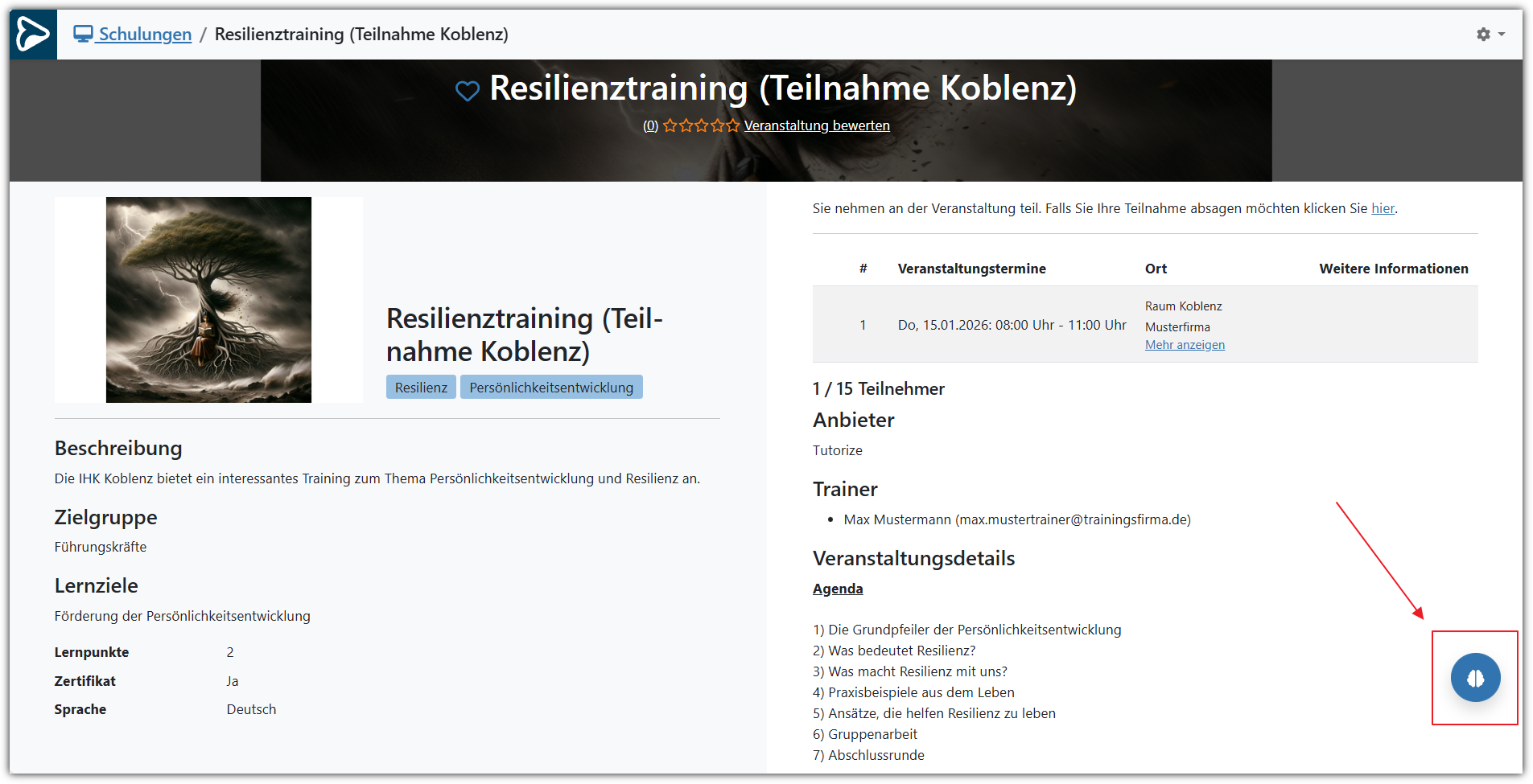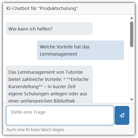 TUTORize stellt seit Version 3.4 einen IONOS KI-Chatbot bereit, den Kunden aktivieren können. Dieser kann für jede einzelne Schulung (E-Learning und Veranstaltungsrahmen) arbeiten und die Lerner bei ihrer Lernreise unterstützen.