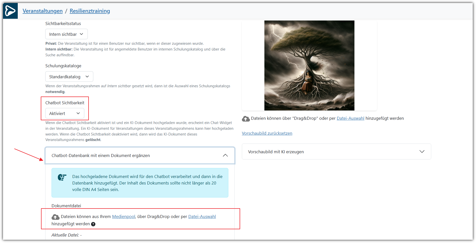 Bei Veranstaltungen findet man die Aktivierung des KI-Chatbots sowie die Option ein KI-Dokument hochzuladen beides im Info-Tab: