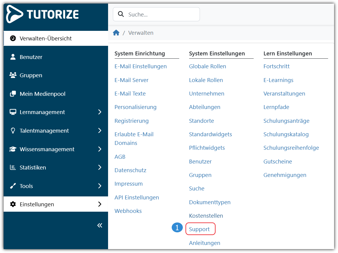 - Um Supporteinstellungen vorzunehmen, wechseln Sie zunächst über "Verwaltenmenü - Einstellungen - Systemeinstellungen - Support" (1.1) in die Verwaltungsübersicht für die Einstellungsoptionen bezogen auf die Funktion “Support”.