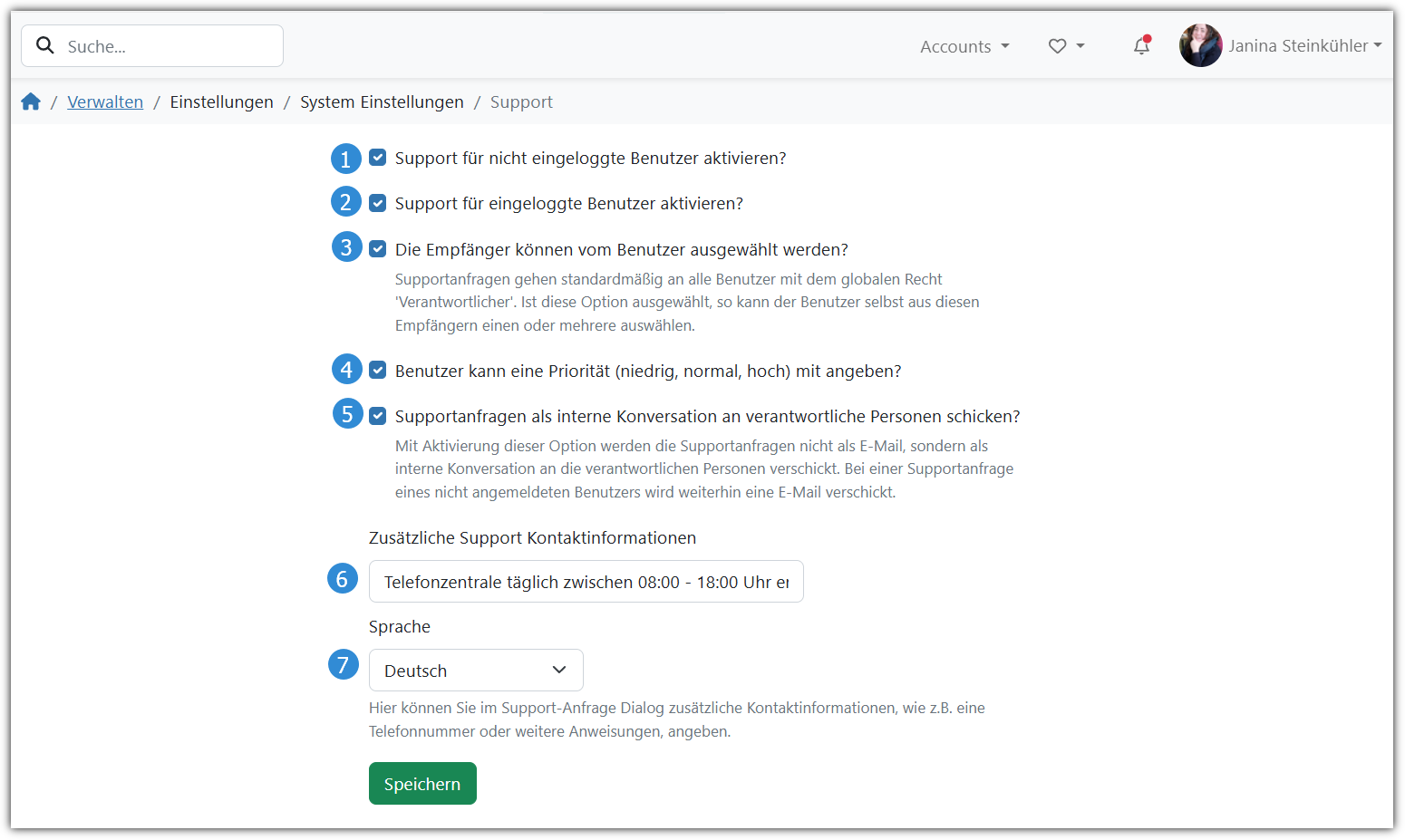 - Auf der Support-Veraltungsseite haben Sie folgende Einstellungsoptionen: