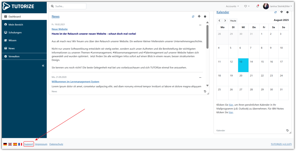 (b) Setzten Sie den Haken bei “Support für eingeloggte Benutzer aktivieren” (2.2), so wird der Support-Link im Footer der Systemseite verfügbar sein.