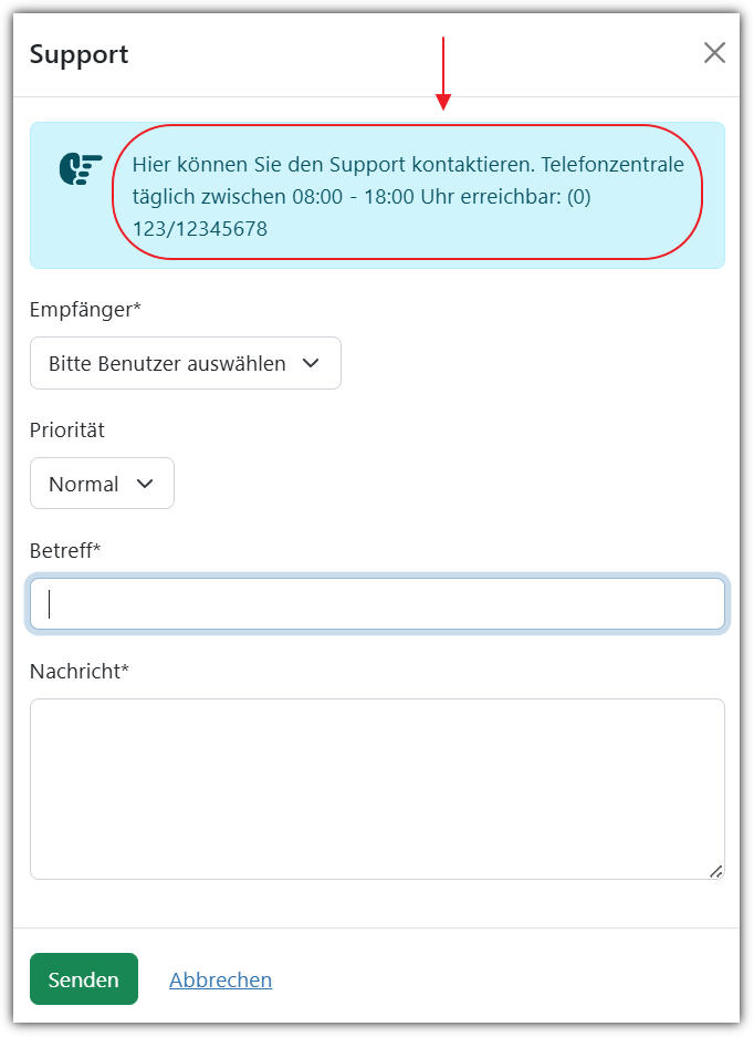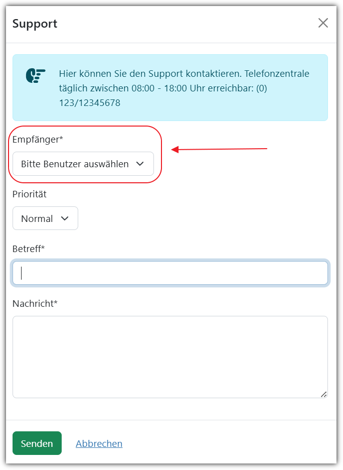 (c) Setzten Sie den Haken bei “die Empfänger können vom Benutzer ausgewählt werden” (2.3), so können die Steller einer Supportfrage mit einem Dropdownfeld einen oder mehrere Empfänger für die Nachricht auswählen. Lässt man diese Option ausgestellt, so gehen alle Supportnachrichten standardmäßig an die Personen mit dem globalen Recht “Verantwortlicher”.