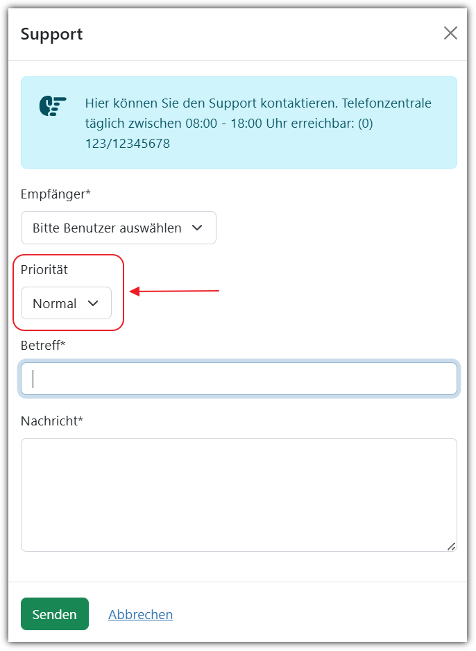 (d) Setzten Sie den Haken bei “Benutzer kann eine Priorität angeben” (2.4), so kann der Benutzer in seiner Nachricht zwischen den Prioritäten “niedrig”, “normal” oder “hoch” auswählen.