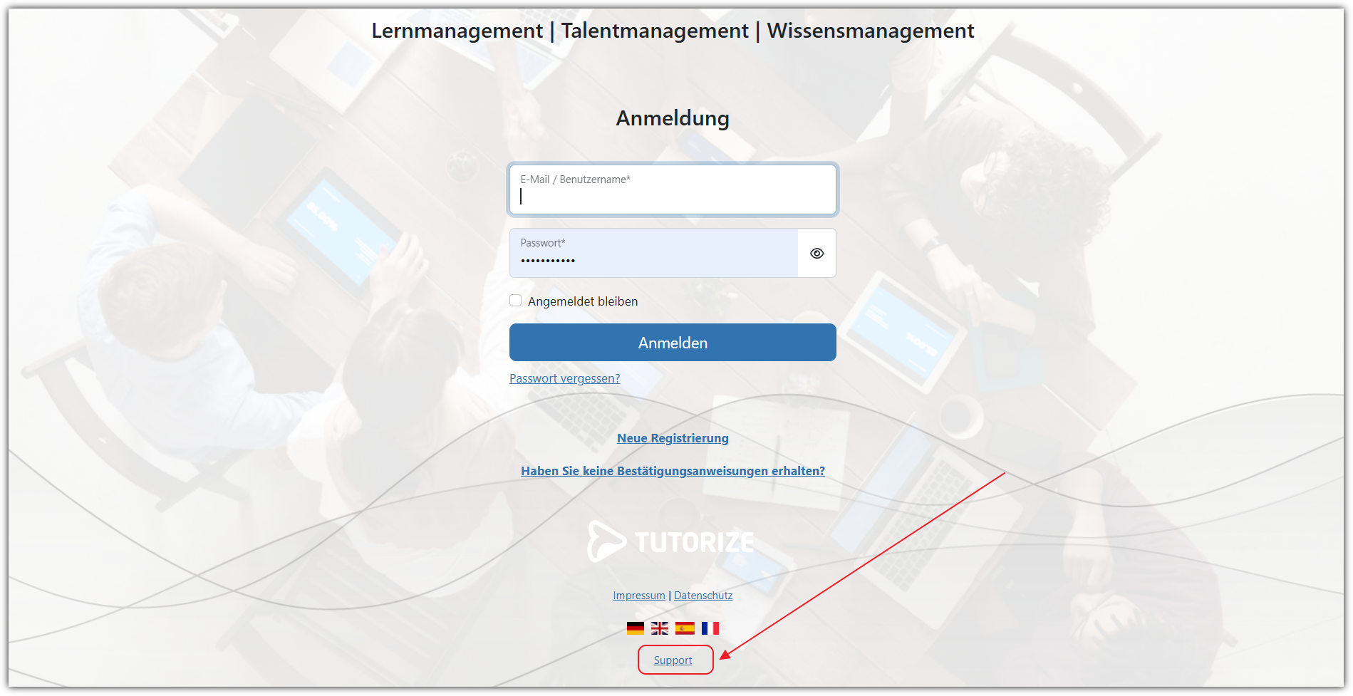 Ist die Support-Funktion auch für Benutzer aktiviert, die nicht im System angemeldet sind, dann finden Sie den Support-Link auch schon auf der Login-Seite vor: