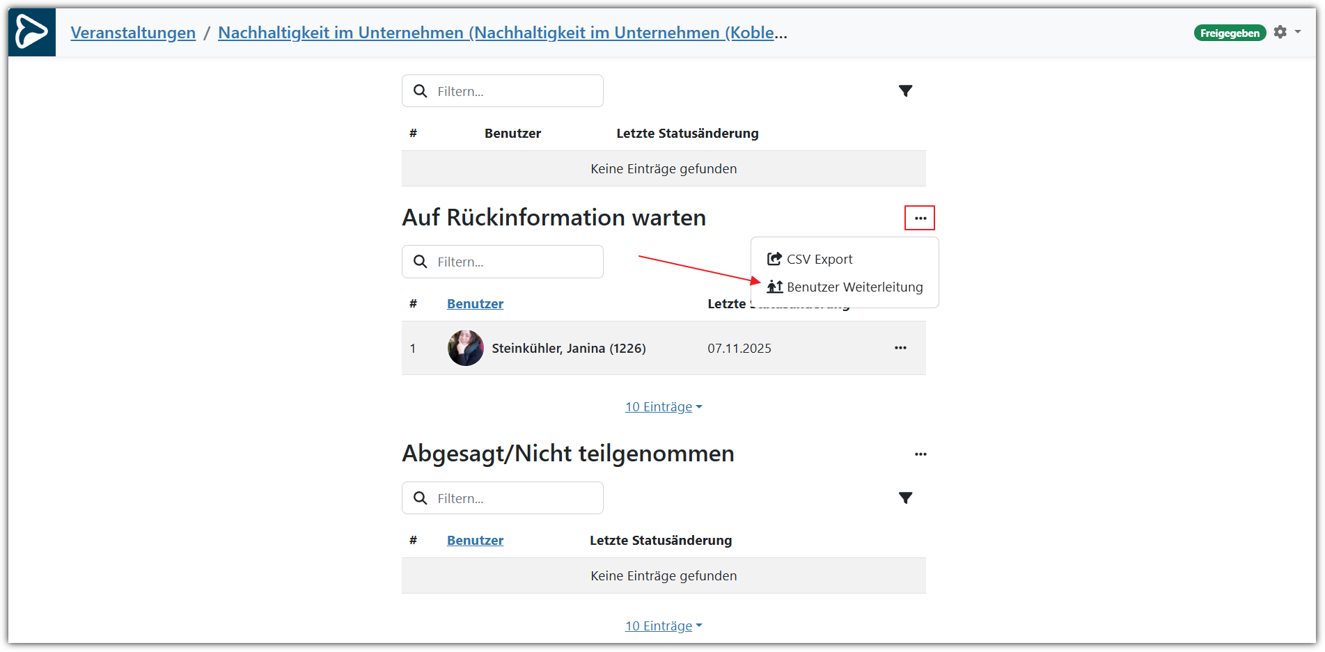 Wenn man in der Teilnehmerverwaltung in den Zeilen "Warteliste" und/ oder "auf Rückinformation warten" auf das Drei-Punkte-Symbol klickt öffnet sich ein Fenster mit dem Menupunkt "Benutzer Weiterleitung". Klickt man darauf, öffnet sich ein Zuweisungsdialog.