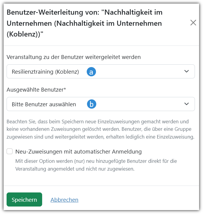 In dem Zuweisungsdialog wählt man in der ersten Zeile (a) eine Veranstaltung aus, zu welcher man den/die Benutzer weiterleiten möchte. Benutzer, die auf der Warteliste geblieben sind und/ oder nicht zu- oder abgesagt hatten, können so einfach zu bspw. einem Folgetermin der Veranstaltung weitergeleitet werden.