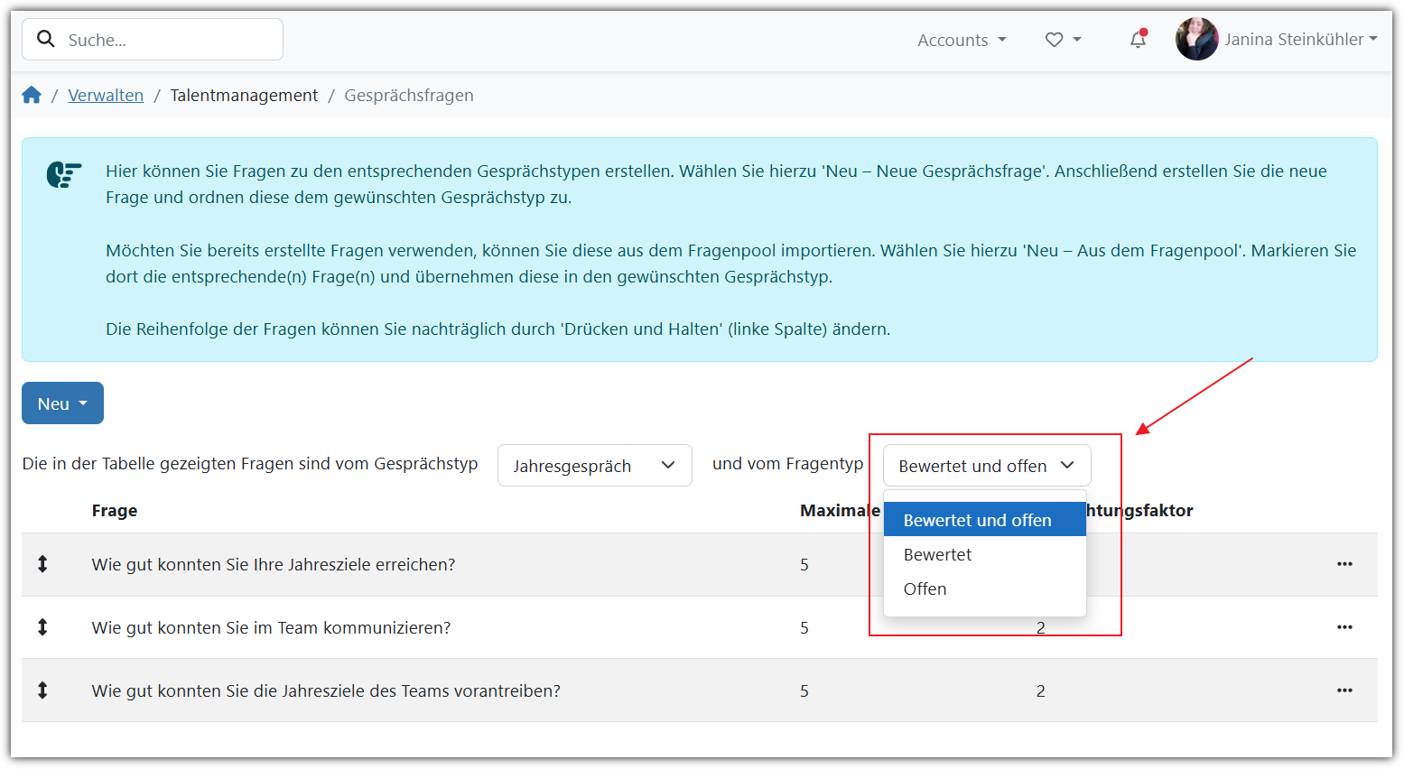 - Um Mitarbeitergesprächsfragen anzulegen und zu