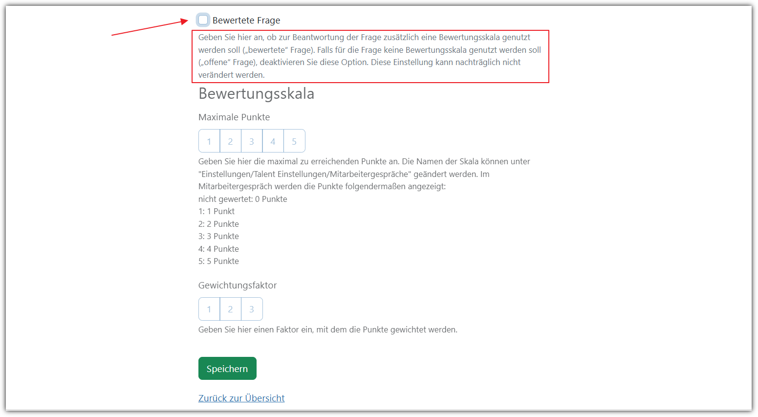 Wird der Haken bei "bewertete Frage" gesetzt, dann ist der Bereich "Bewertungsskala" nicht mehr ausgegraut und kann wie erwünscht eingestellt werden. Soll es sich hier um eine offene Frage ohne Bewertungen handelt, setzten Sie keinen Haken an dieser Stelle. Die Einstellung kann nachträglich nicht mehr verändert werden.