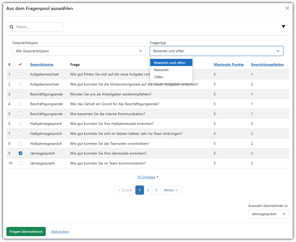 Über den Button "Fragen übernehmen" speichern Sie dann die ausgewählten Fragen in den gewünschten Gesprächstypen ab.